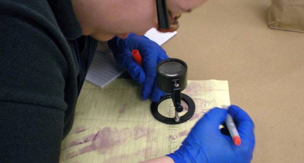 يستخدم الفاحص عدسةً مكبِّرة (لوب) لمعاينة التفاصيل الدقيقة لبصمة الإصبع.