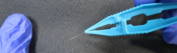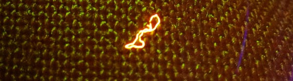 يمكن رؤية ألياف دقيقة جدًا وجمعها باستخدام مجموعة متنوعة من التقنيات مثل مصادر الإضاءة البديلة. في هذه الصورة، تتفلور ليفة صغيرة ويجري جمعها بسهولة من قطعة ملابس.